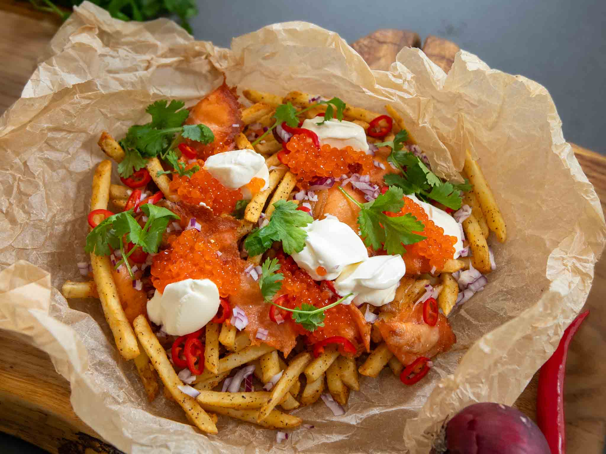 - Rypistä leivinpaperi ja asettele se airfryeriin. Kaada päälle ranskalaiset ja niiden päälle kirjolohipekonit. Paista 200 astetta 12 min.