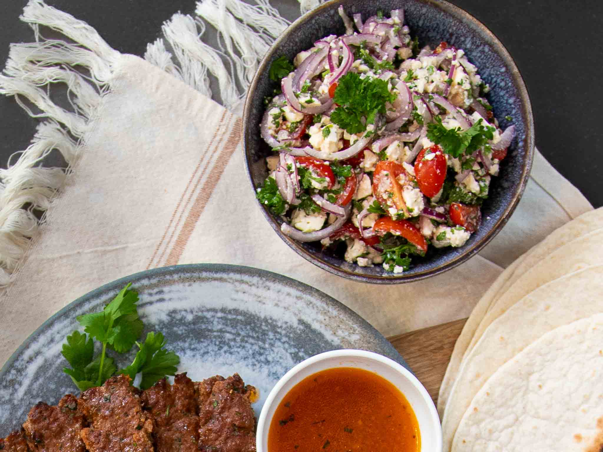 Tämä salaatti sopii lisukkeeksi lautaselle mutta erittäin hyvin saslik kebabin ja tsatsikin kaveriksi tortillan väliin. Reseptit löytyy kaikki täältä.